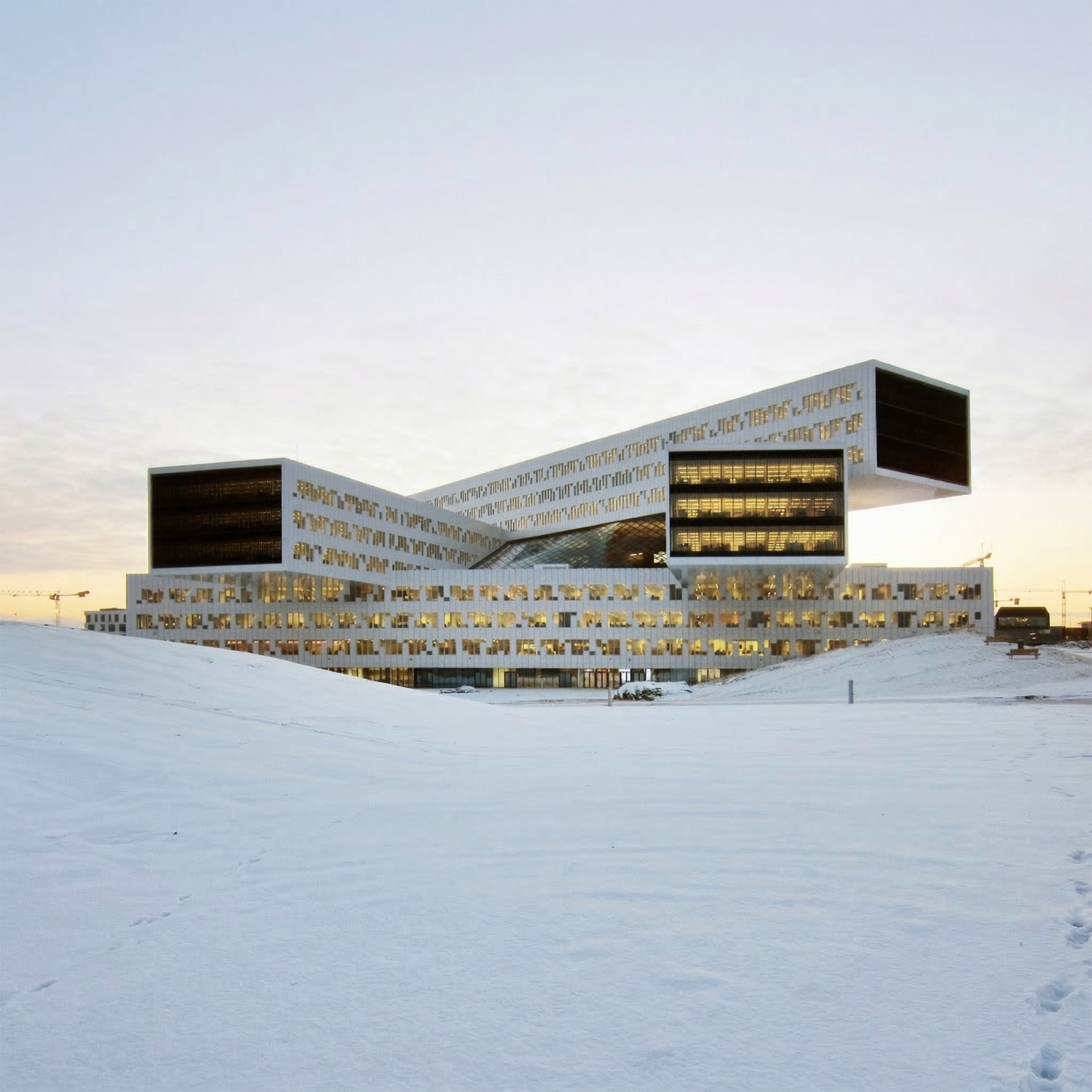 Die Fassadenelemente wurden im Werk als etwa 220 mm tiefe Kassetten vorgefertigt und montagefertig auf die Baustelle geliefert. Der 2012 fertiggestellte Bürokomplex wurde vom norwegischen Architekturbüro A-Lab entworfen und besteht aus fünf übereinander gestapelten Baukörpern, die sich wie überdimensionale Balken kreuzen und bis zu 140 m lang sind.