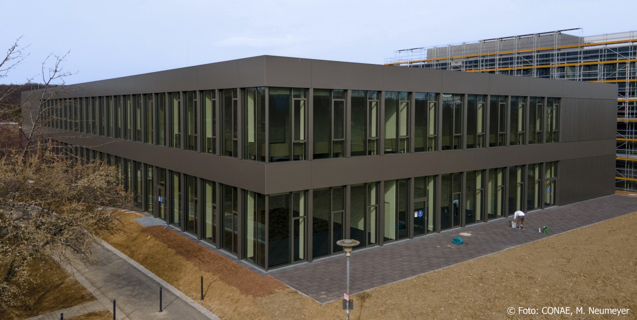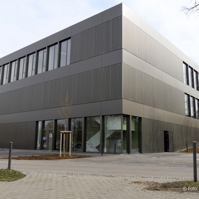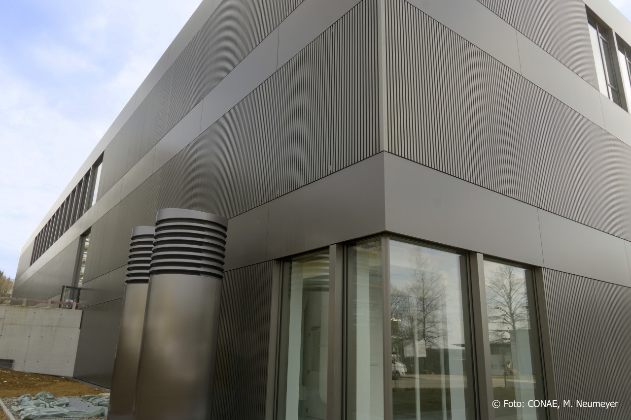 Das neue Zentrum für Angewandte Quantentechnologie in Stuttgart vereint Experten aus Quantenphysik und Photonik mit Ingenieuren, um die angewandte Quantentechnologie – insbesondere im Bereich der Quantensensoren – weiterzuentwickeln. An der Fassade wurden bis September 2020 insgesamt rund 1.300 m² etalbond® FR Aluminium-Verbundplatten im Farbton RAL 7048 matt verbaut. Der spezielle Farbton wurde sorgfältig auf die übrigen Fassadenelemente abgestimmt. Besonders hervorzuheben ist die verdeckte Befestigung der bis zu 1.500 x 4.800 mm großen Platten.
