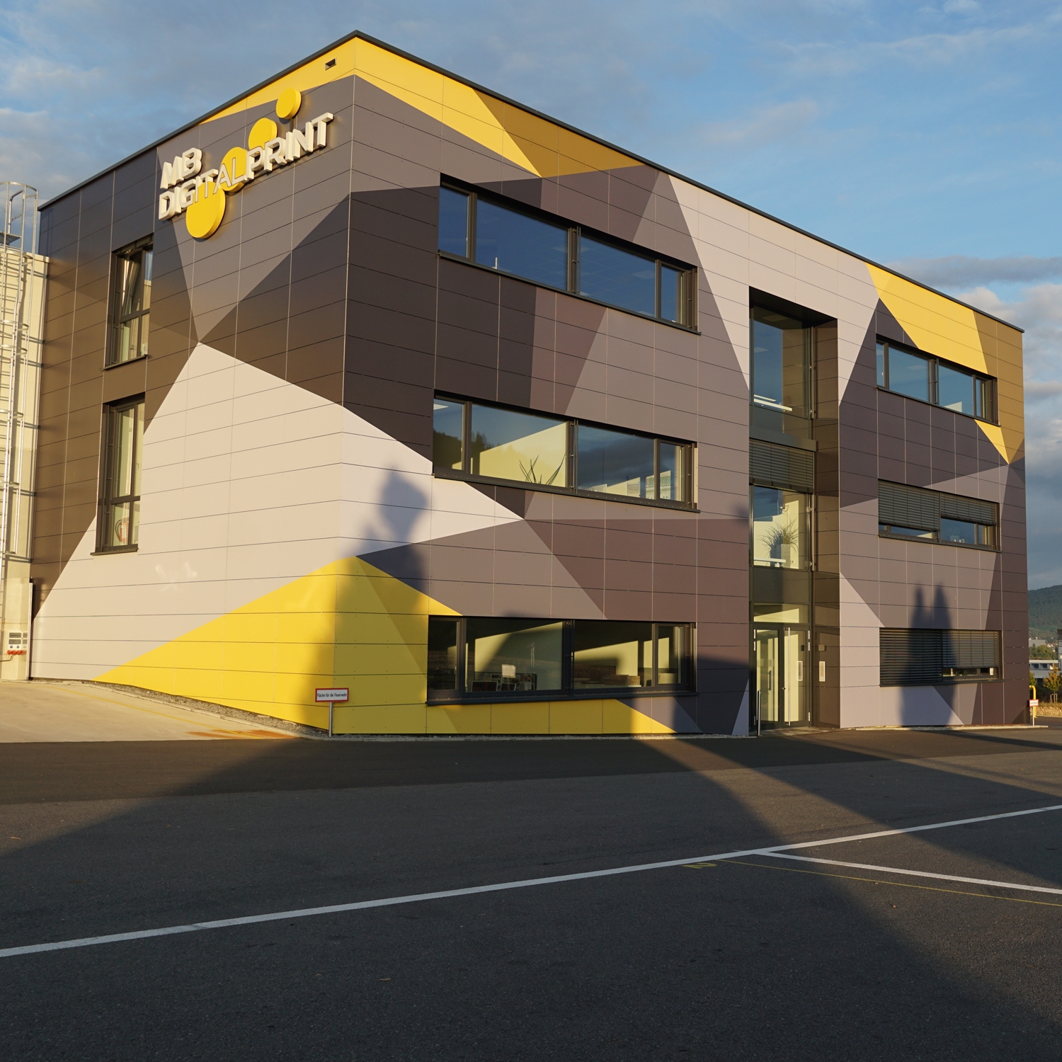 Das 2018 eröffnete Bürogebäude der Firma MB Digitalprint in Kleinheubach überzeugt durch eine markante Fassadengestaltung mit rund 800 m² sichtbar genieteter LIFESTYLEBOARD A2 Aluminiumverbundplatten. Ein besonderes Highlight ist die individuelle Beschichtung jeder einzelnen Platte: Auf Basis der architektonischen Gestaltungsvorgaben wurden die Oberflächen individuell bedruckt und mit einer speziell entwickelten Veredelung versehen, die sowohl gestalterische Freiheit als auch höchste Beständigkeit im Außenbereich gewährleistet.