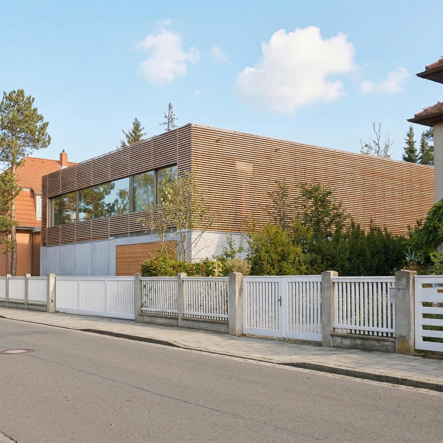 Für das Einfamilienhaus im Leipziger Süden wurden im Jahr 2016 flache Platten mit 20 mm Dicke produziert. Auf Kundenwunsch sind auf der Oberfläche Eindrücke von Massivbetonschalungen immitiert.| Farbe | S02 Beton Grau (concrete grey) |
