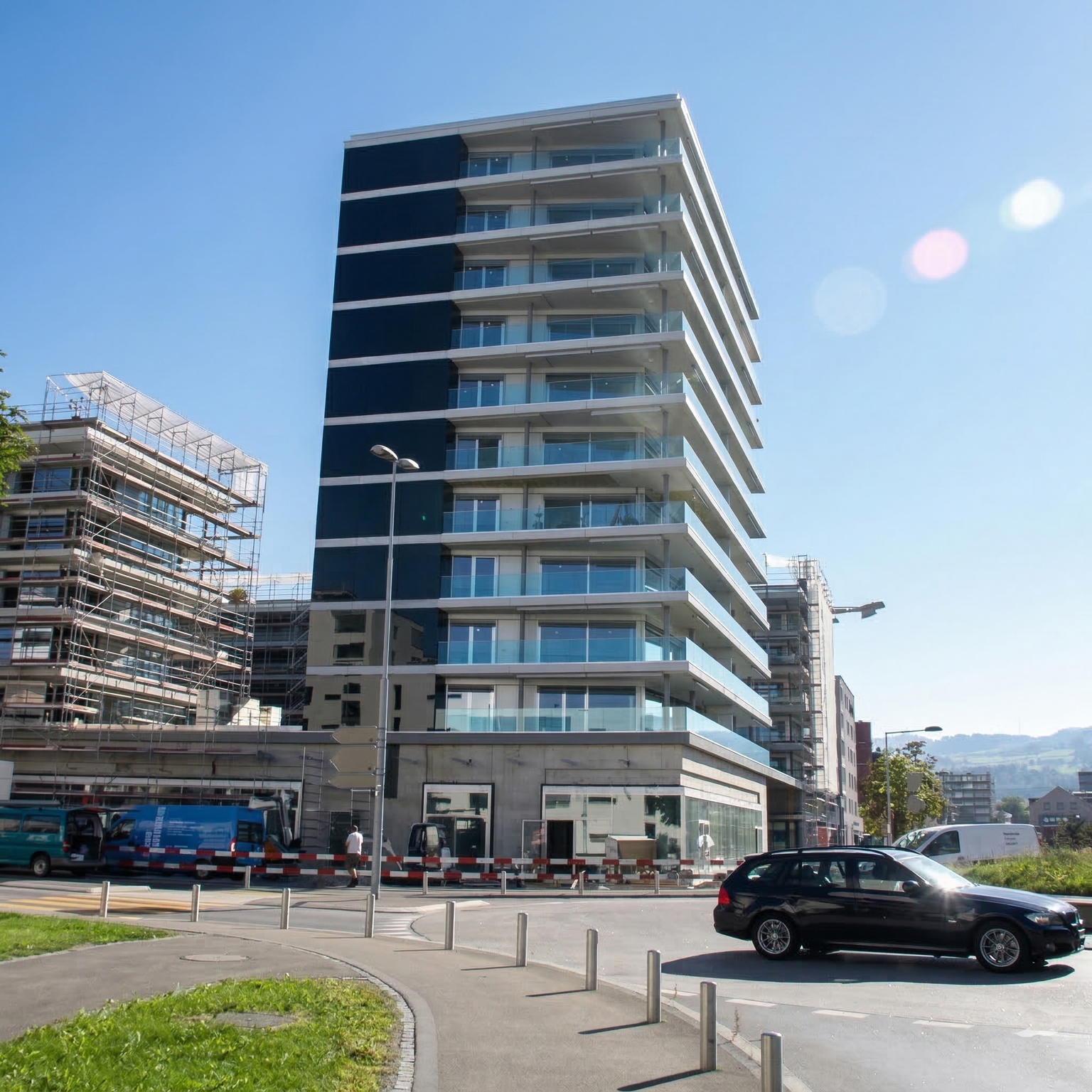 2013 wurde der Wohnkomplex einer gehobenen Wohngegend in Zug / Schweiz gebaut. Zwischen den hochglänzenden schwarzen Fassadenelementen wurden jeweils polycon Streifen mit natürlichen Sichtbeton - Look eingesetzt. Die Streifen gehen nahtlos in den Massivbeton - Balkonbereich über. Der Architekt wählte den Farbton S02 Beton Grau (concrete grey) mit glatten Oberflächen.