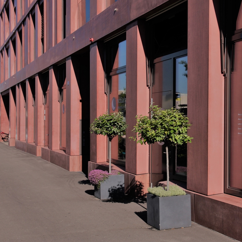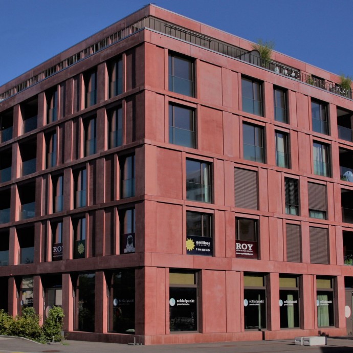 Wohn-und Gewerbeüberbauung ROY – Die hof- und strassenseitigen Fassaden sind identisch gestaltet. Die eingefärbten Faserbetonelemente verleihen der Fassade die notwendige Wertigkeit und Identität. Ein durchlaufendes Raster gliedern die Fassaden. Durch Vor-und Rücksprünge erhält die Fassade eine reliefartige Ausformulierung, deren Ausdruck in der Tiefe durch das Spiel von Licht und Schatten verstärkt wird. Insgesamt wurden ca. 12.000 m² polycon Glasfaserbeton mit 16 mm Wandstärke geliefert. Diese wurden mittels KEIL Hinterschnittanker und Agraffen-Einhängesystem auf einer Alu-Unterkonstruktion befestigt. Architekt: Dachtler Partner AG Architekten, Zürich