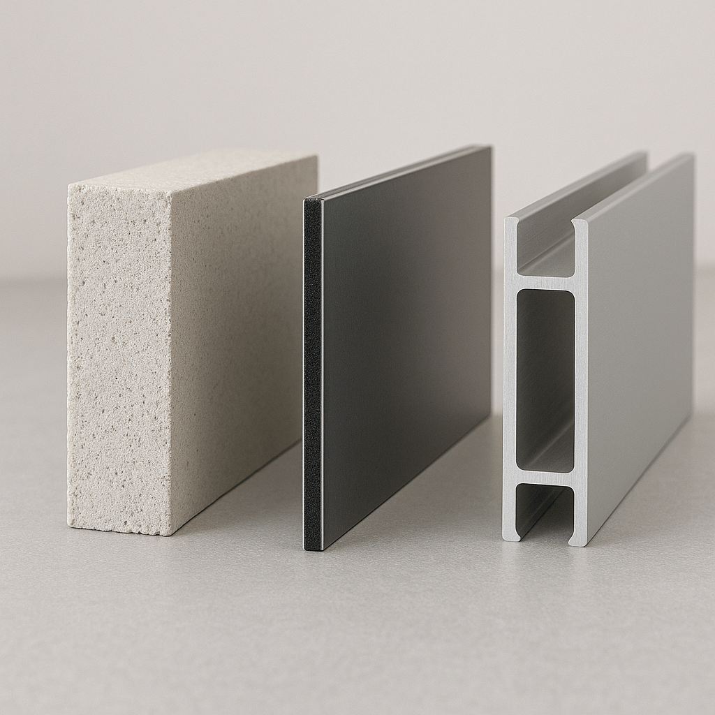 Aluminium-Verbundplatten und Faserbeton eignen sich dank ihres geringen Gewichts und ihrer hohen Stabilität hervorragend für die industrielle Vorfertigung im Modulbau – etwa bei Nasszellen oder vorgefertigten Elementfassaden.