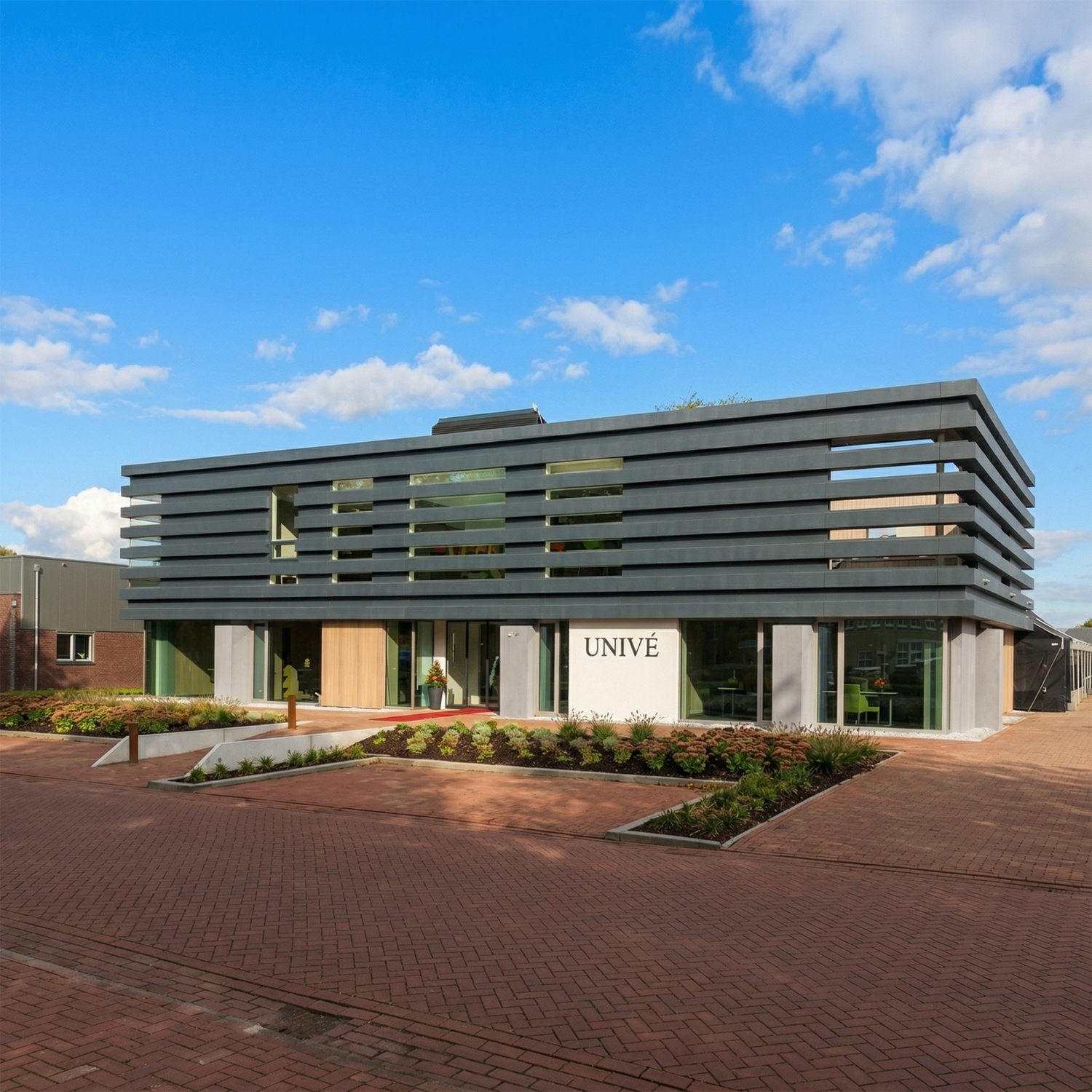 Für das Bürogebäude des Unternehmen Unive in Holland wurde die Farbe 816 Basalt Black (Basalt Schwarz) mit Strukturoberfläche gewählt. Die langgezogenen horizontalen Linien in der Fassade in Verbindung mit dem schwarzen Basalt verleihen der Fassade ein exklusives Design.