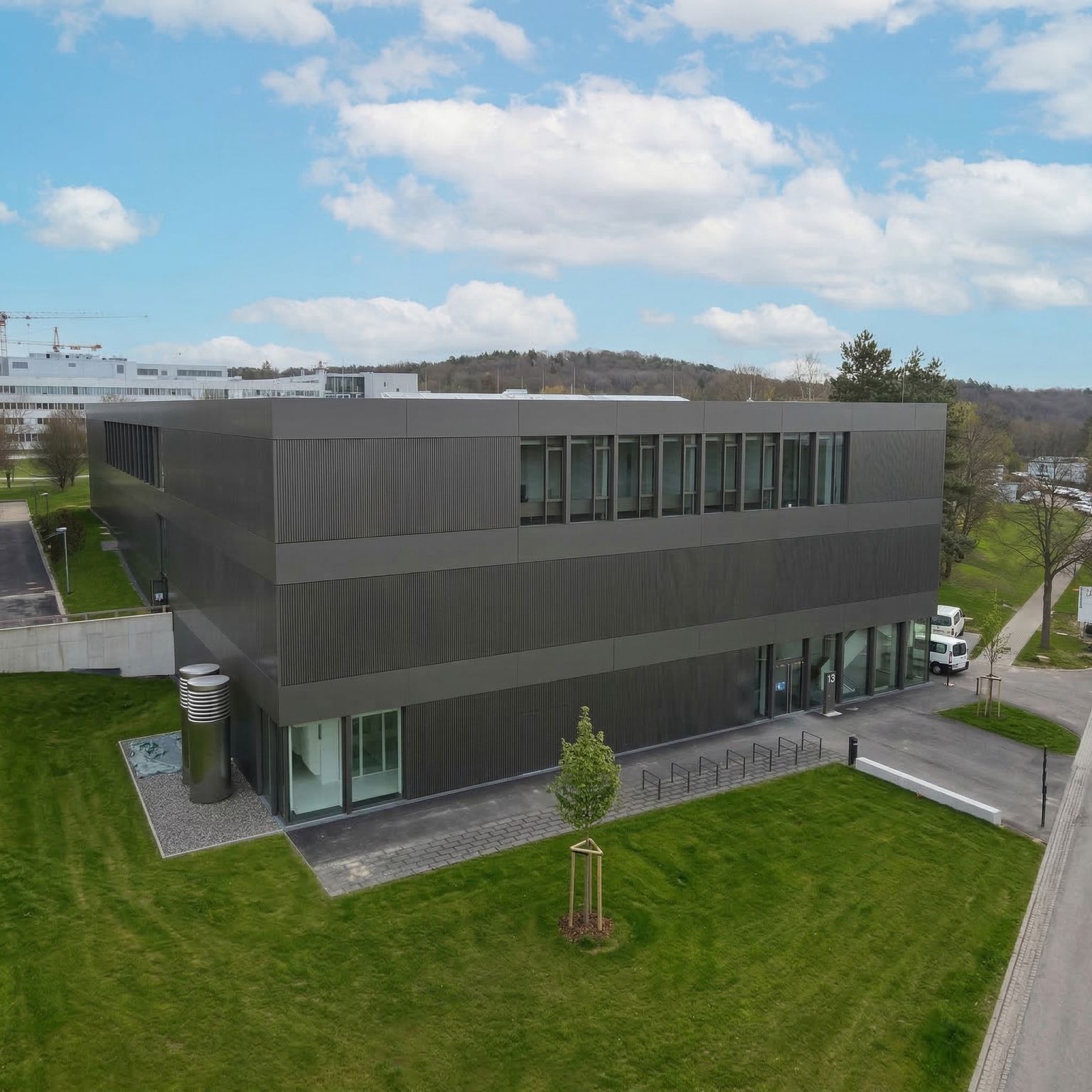Das neue Zentrum für Angewandte Quantentechnologie in Stuttgart vereint Experten aus Quantenphysik und Photonik mit Ingenieuren, um die angewandte Quantentechnologie – insbesondere im Bereich der Quantensensoren – weiterzuentwickeln. An der Fassade wurden bis September 2020 insgesamt rund 1.300 m² etalbond® FR Aluminium-Verbundplatten im Farbton RAL 7048 matt verbaut. Der spezielle Farbton wurde sorgfältig auf die übrigen Fassadenelemente abgestimmt. Besonders hervorzuheben ist die verdeckte Befestigung der bis zu 1.500 x 4.800 mm großen Platten.