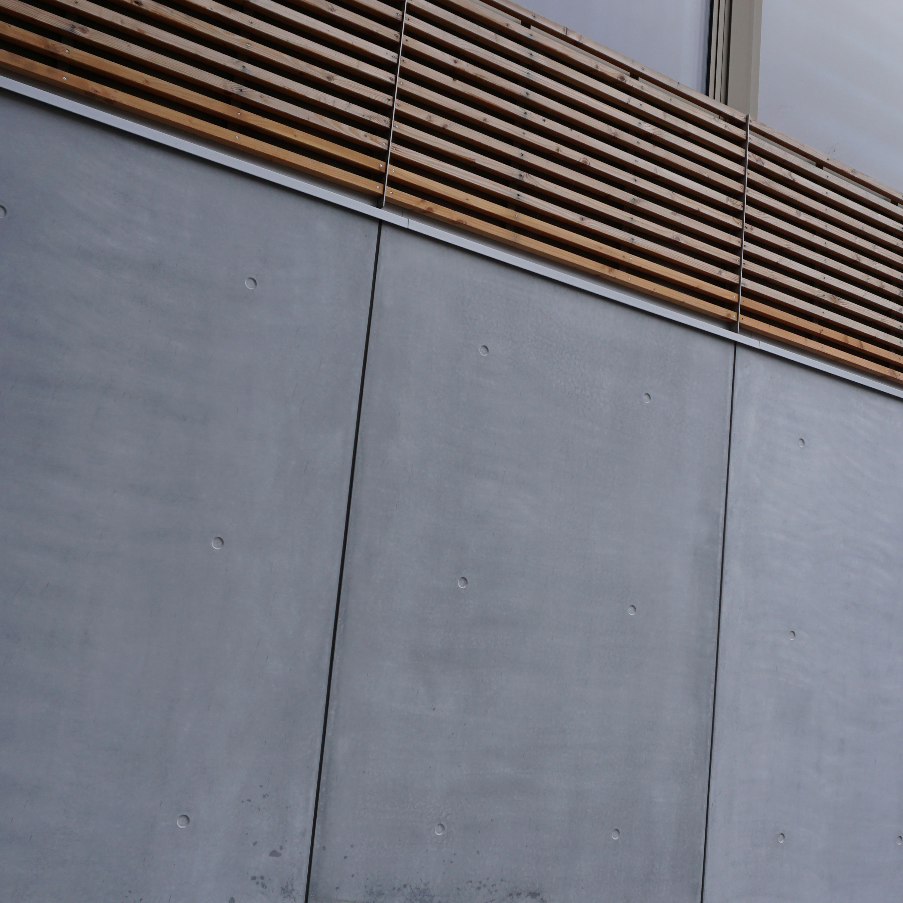 Für das Einfamilienhaus im Leipziger Süden wurden im Jahr 2016 flache Platten mit 20 mm Dicke produziert. Auf Kundenwunsch sind auf der Oberfläche Eindrücke von Massivbetonschalungen immitiert.| Farbe | S02 Beton Grau (concrete grey) |