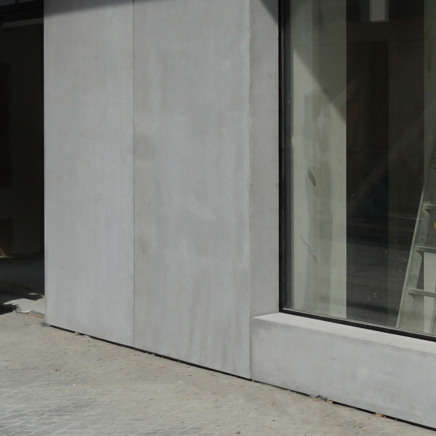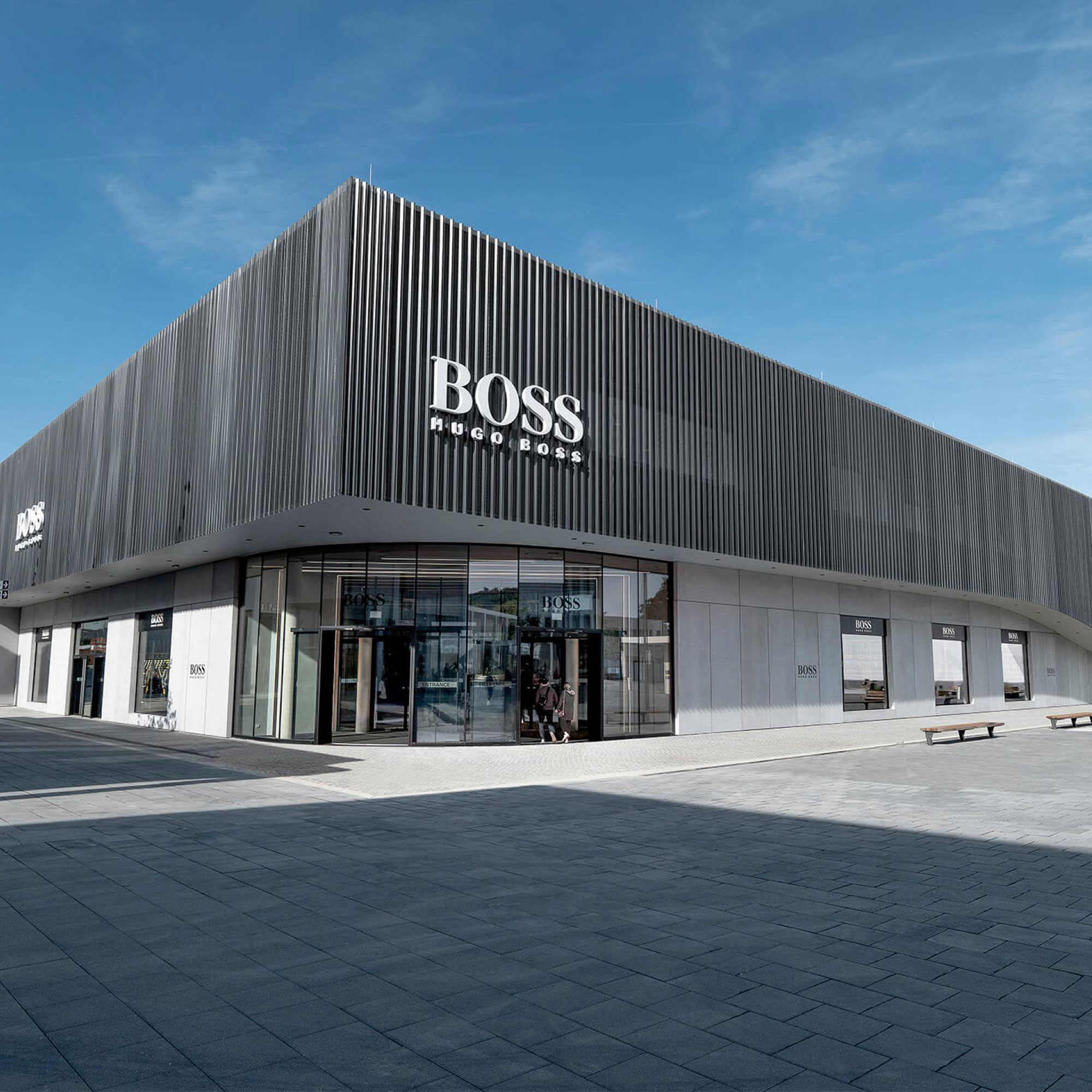 Das weltweit größte BOSS Outlet in Metzingen bei Stuttgart. Ein Teil der Fassade wurde mit 20 mm dickem Polycon Faserbeton begleitet. Die Platten sind teils über 4.000 mm hoch oder als scharfkantige 3D Elemente im Fensterbereich produziert.| Farbe | S03 Samt Grau |