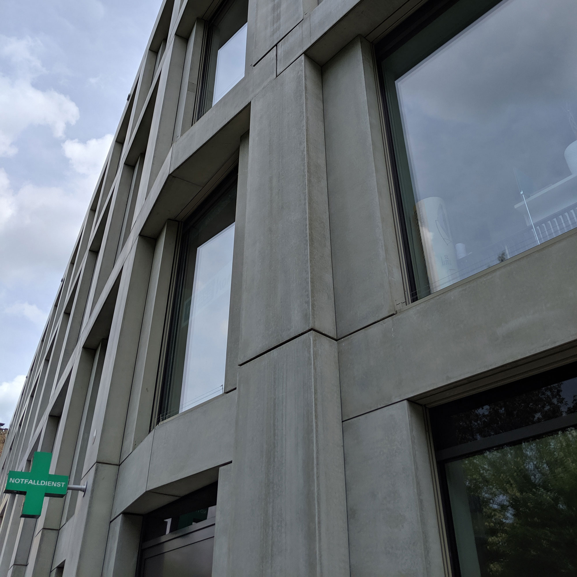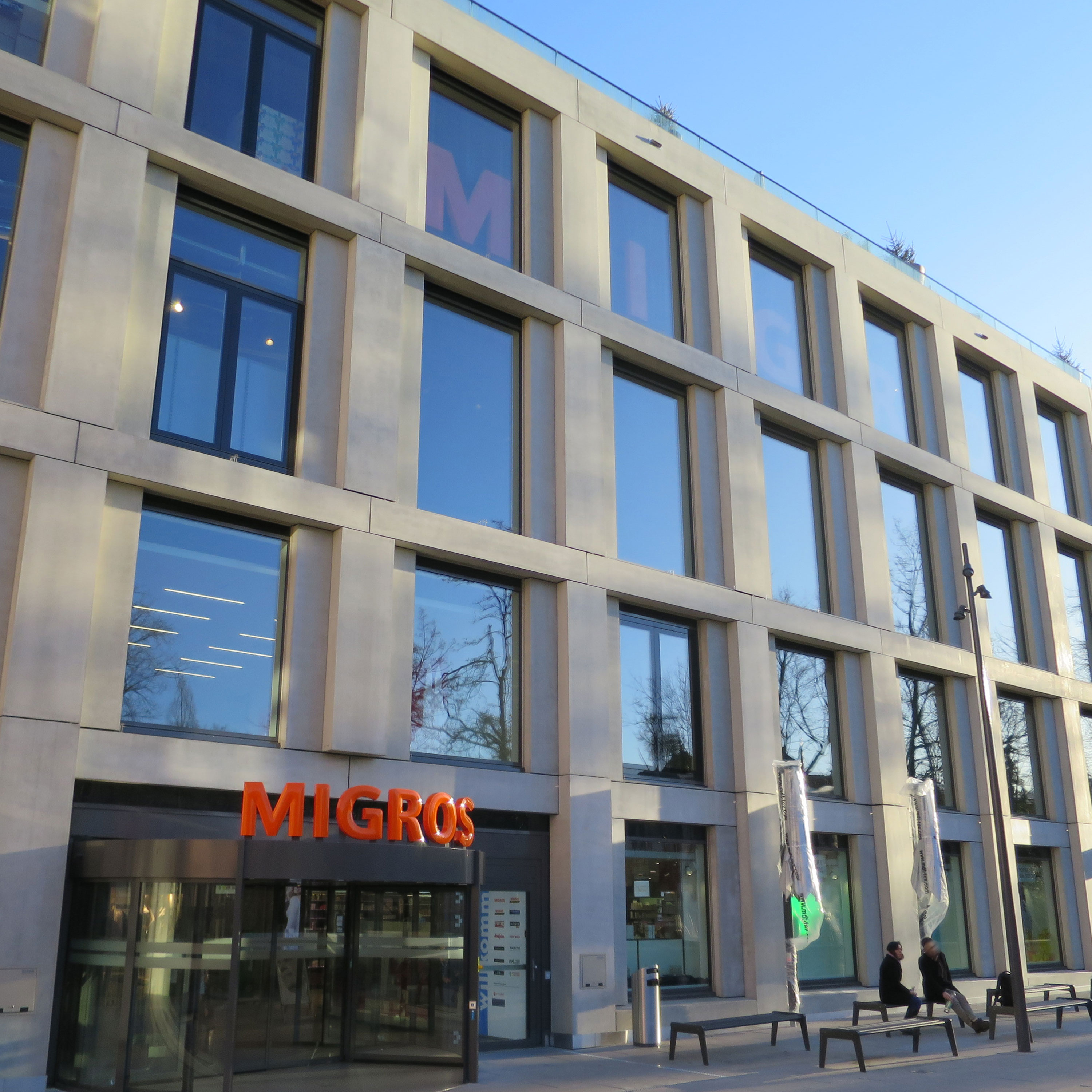 Fassade aus Glasfaserbeton für Bestandsgebäude – Um dem Sitz der Migros City in Zürich nach über 30-jähriger Nutzung ein neues Gesicht zu verleihen, wurde er einer umfassenden Sanierung unterzogen. Die neue Gebäudehülle sollte eine Lochfassade sein. Die Architekten entschieden sich für Fassadenelemente aus „Polycon“. Es handelt sich dabei um einen feuerfesten (A1) Verbundbaustoff aus glasfaserverstärktem Beton. Er wird meist in Form von Platten geliefert, die sich sowohl für den Innen- als auch für den Außenbereich eignen. Darüber hinaus kann Polycon für die Herstellung von Einrichtungsgegenständen, akustischen Paneelen, Stadtmobiliar und vielem mehr verwendet werden. Bei den Fassaden der Migros City wurden dreidimensionale Elemente einer hinterlüfteten Fassade gefertigt. – Architekt: Atelier-ww.ch