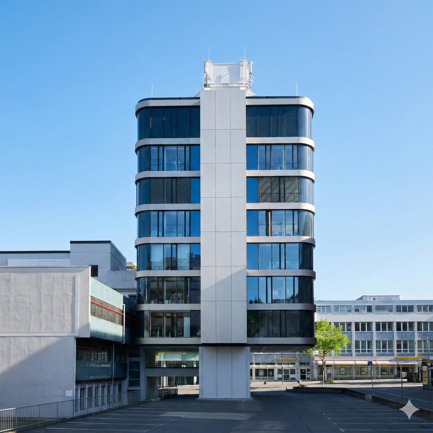 Die Sanierung des markanten Hochhauses aus den 1960er-Jahren stärkt die Präsenz der Kreissparkasse im Herzen der Waiblinger Innenstadt. Nach den Entwürfen des Architekturbüros Auer Weber wurde insbesondere das Eingangsportal im Erdgeschoss neu gestaltet: