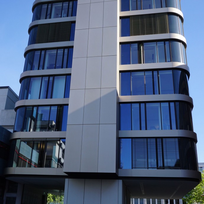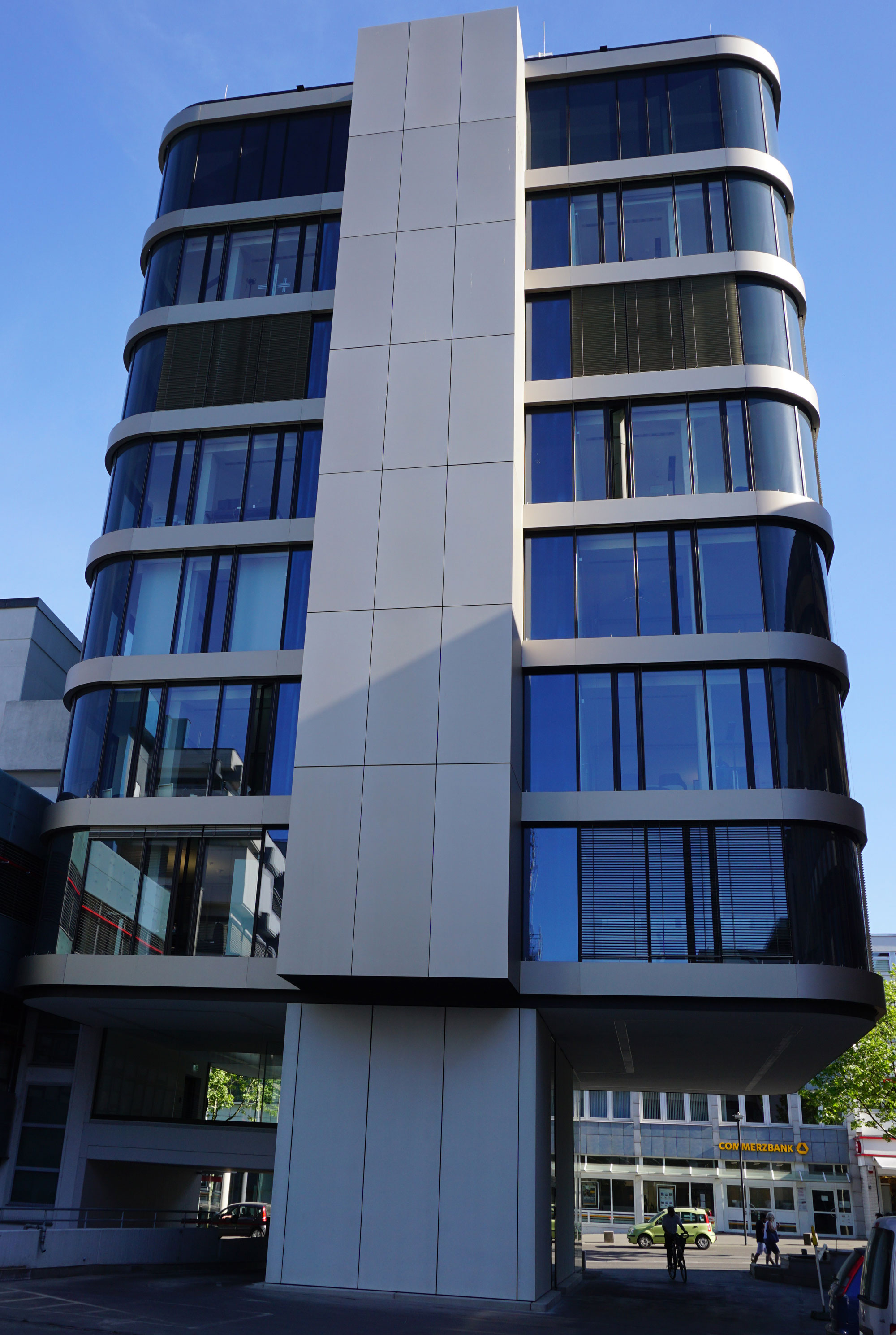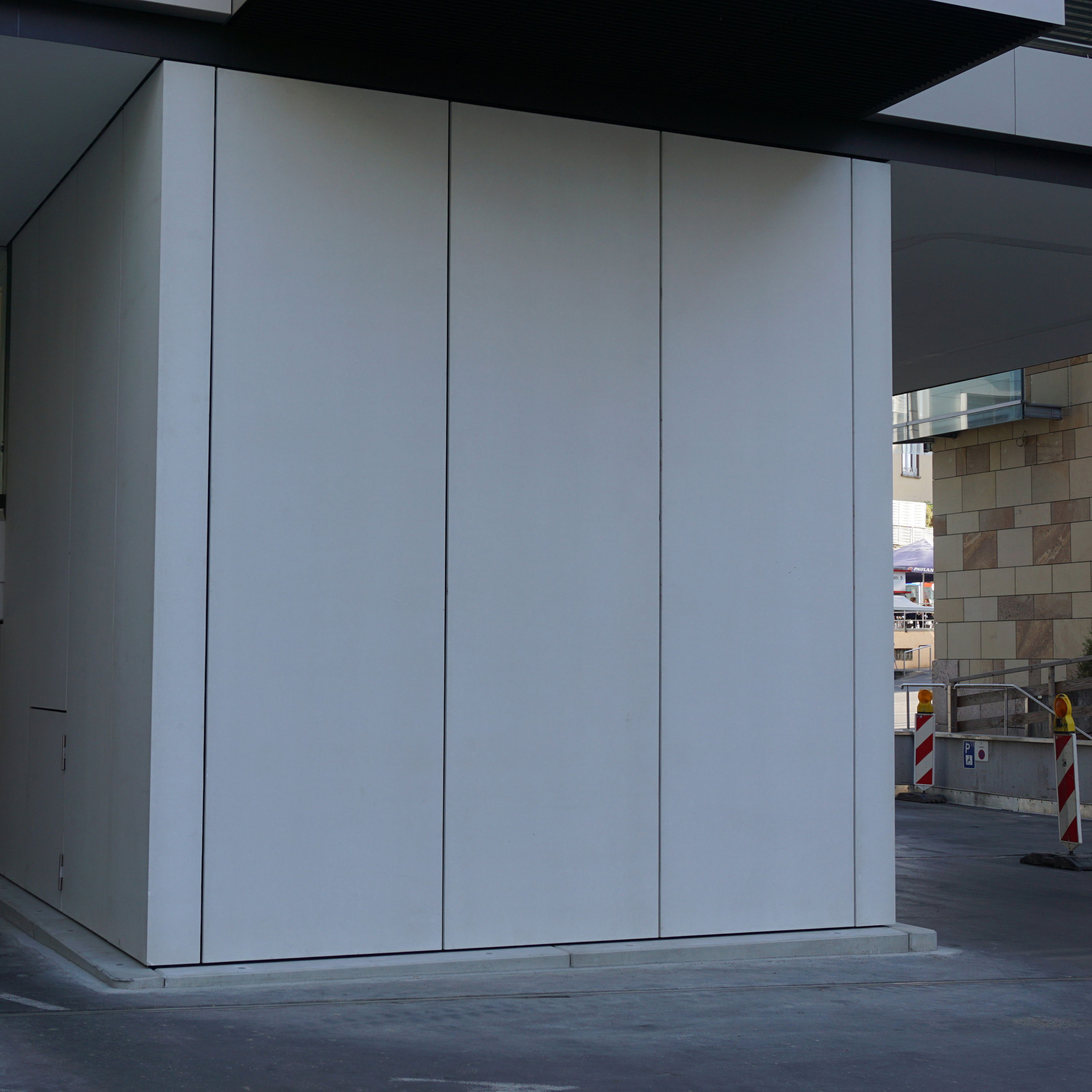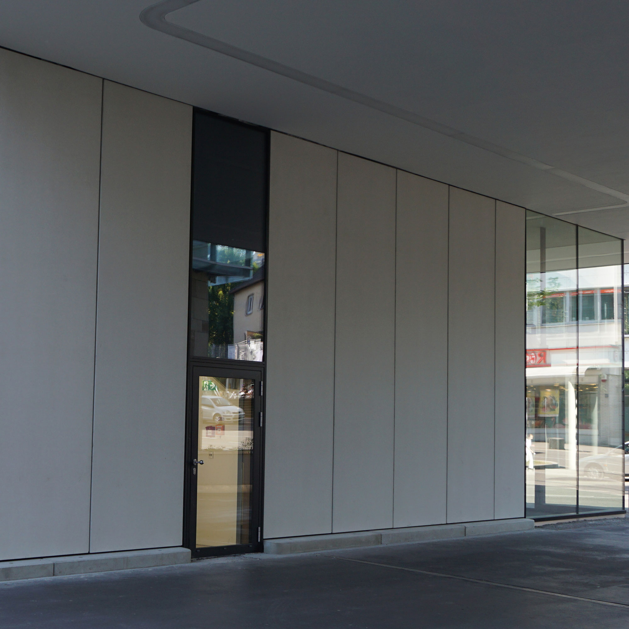 Sanierung „Turm“ Kreissparkasse Waiblingen – Die Sanierung des Hochhauses aus den 60er Jahren stärkt den Standort der Kreissparkasse in der Innenstadt von Waiblingen. Im Bereich des Erdgeschoss-Eingangsportal wurden Polycon Glasfaserbeton Platten und 3D-Eckelemente mit ca. 4.900 mm Höhe montiert. Die Farbe der Elemente ist S01 Weiß mit angesäuerter Oberfläche. – Architekt: Auer Weber
